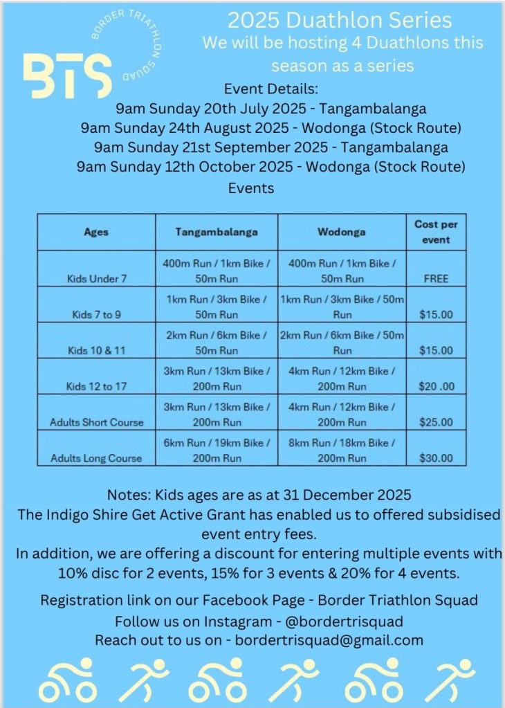 Our Aquathlon series will see 2 events at the Albury Pool in a run/swim/run format. The first run will be kept short to break up congestion and to also keep you fresh enough for the swim.